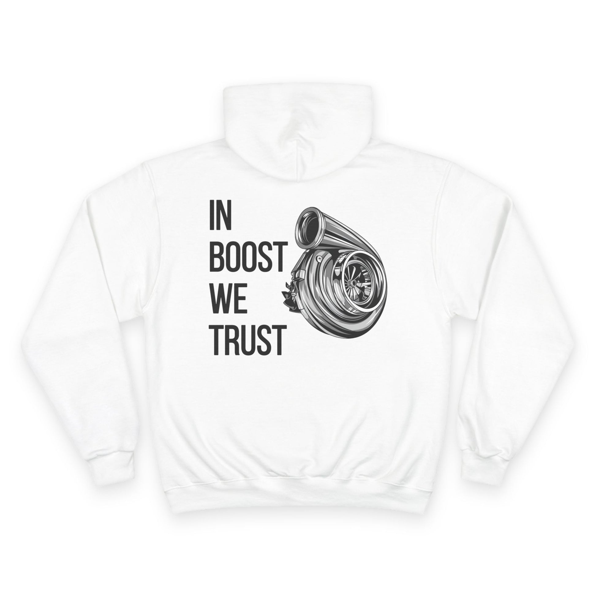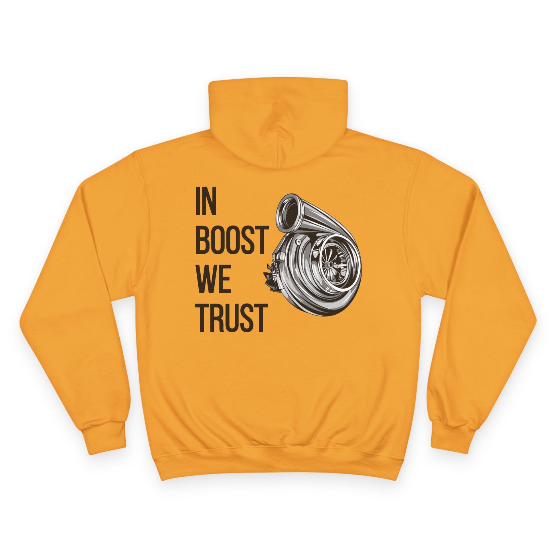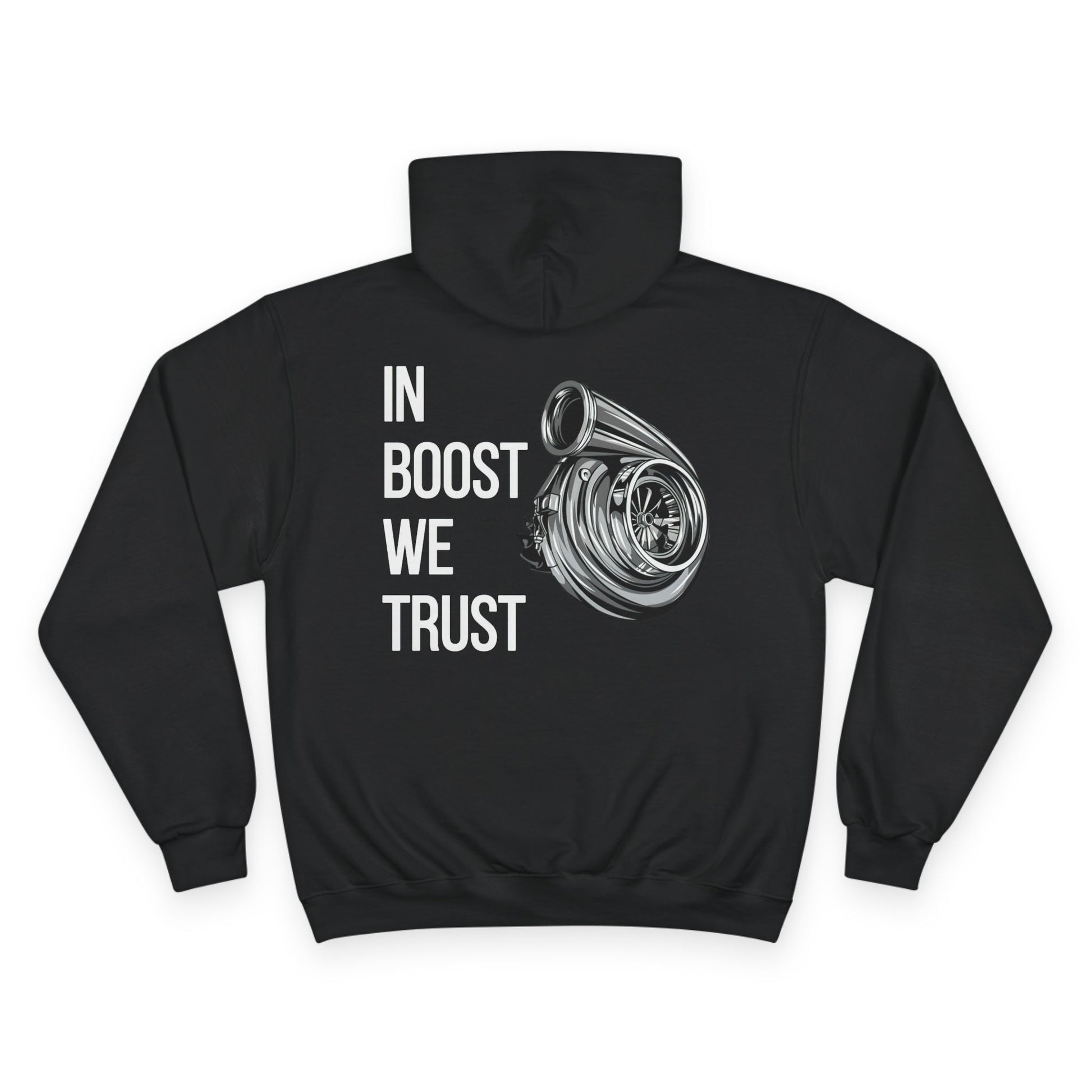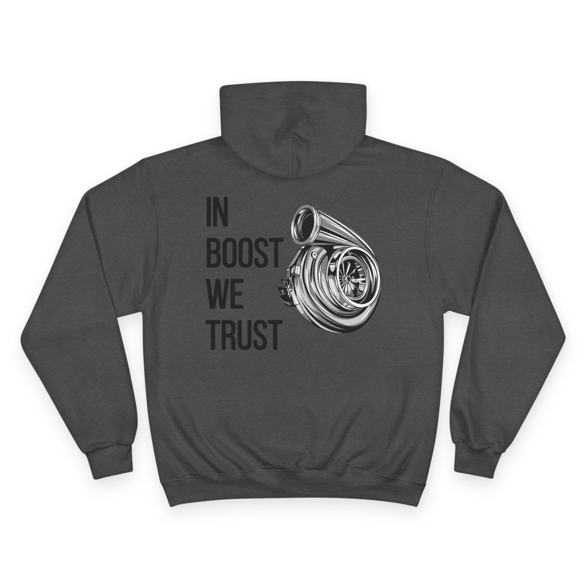 Stay warm and stylish with this custom Champion Unisex Hoodie featuring the 'In Boost We Trust' design by Revolution Society. Perfect for car enthusiasts, this hoodie gives off a cool and sleek vibe. Whether you're attending a car meet or just hanging out with fellow car lovers, this hoodie is a must-have. Great for gifting during holidays like birthdays or Christmas.