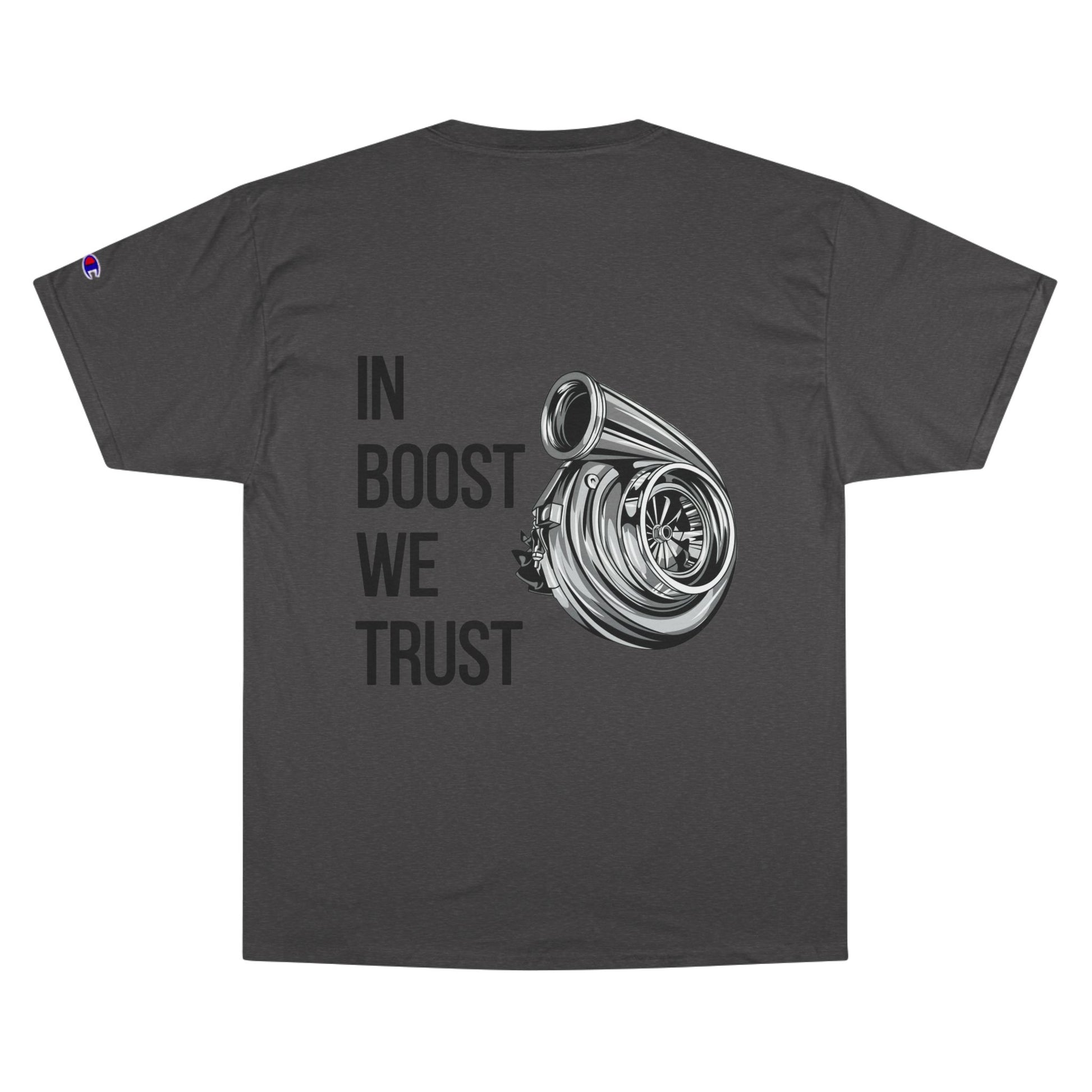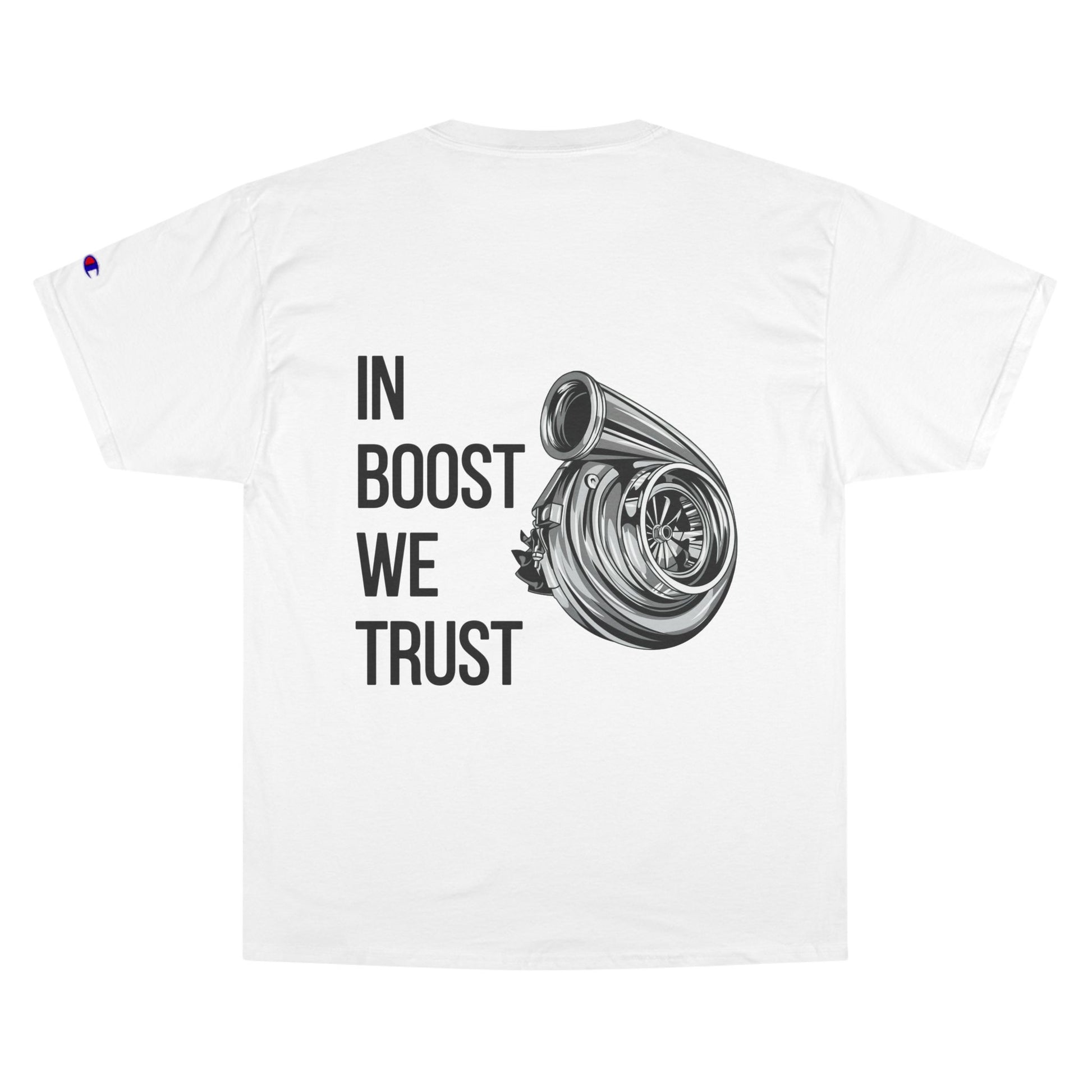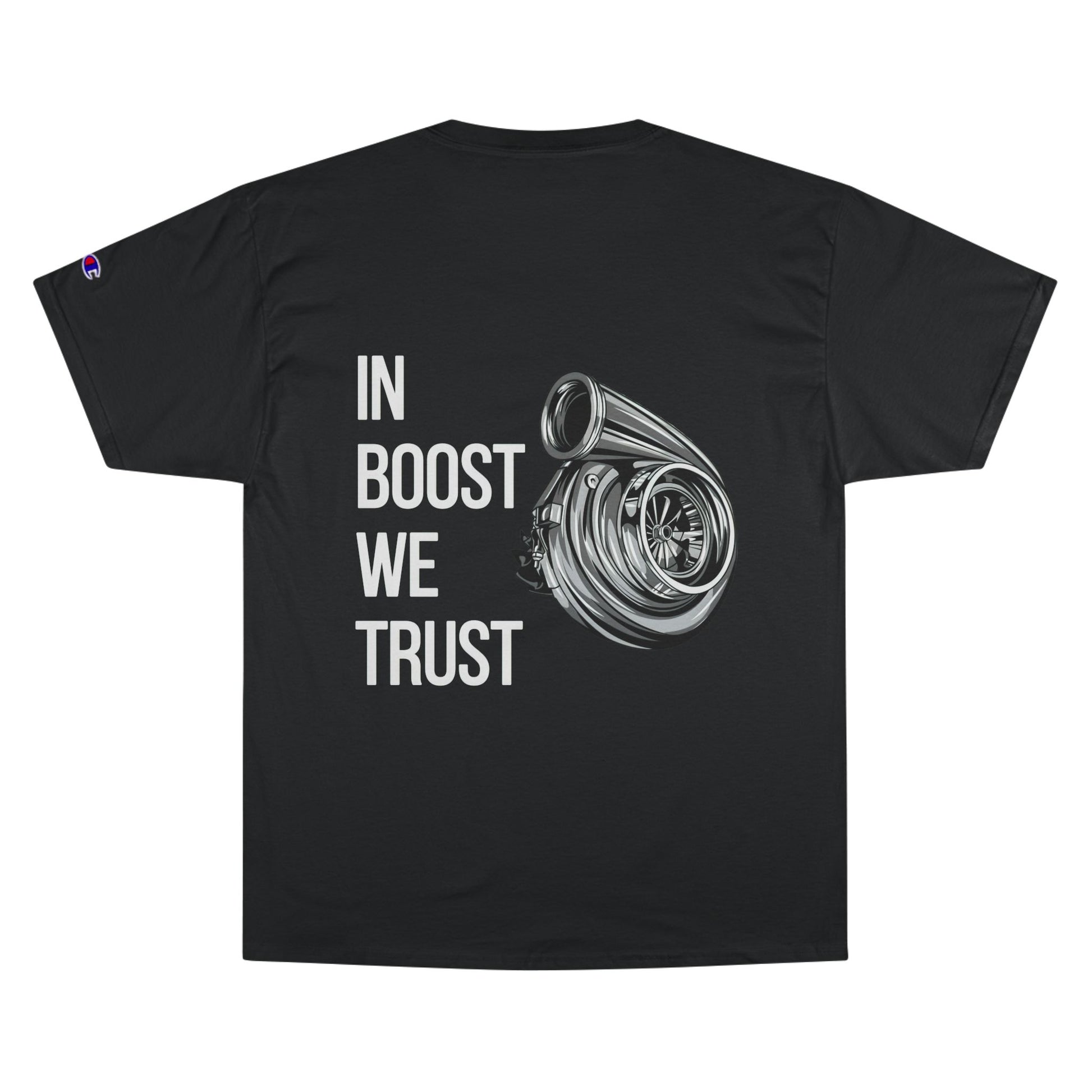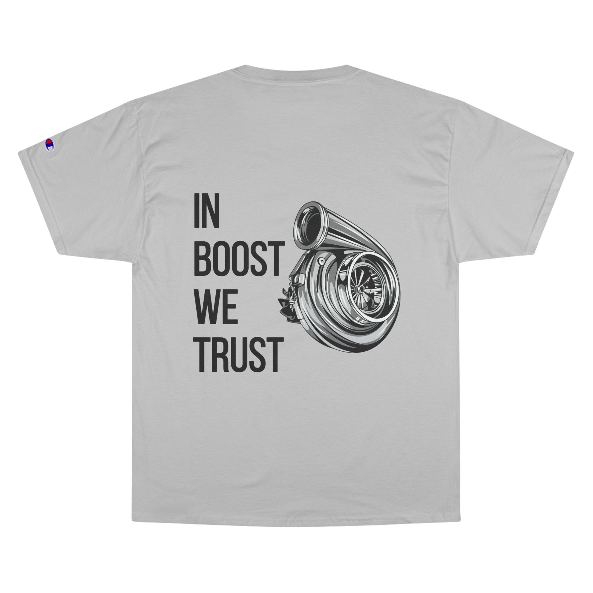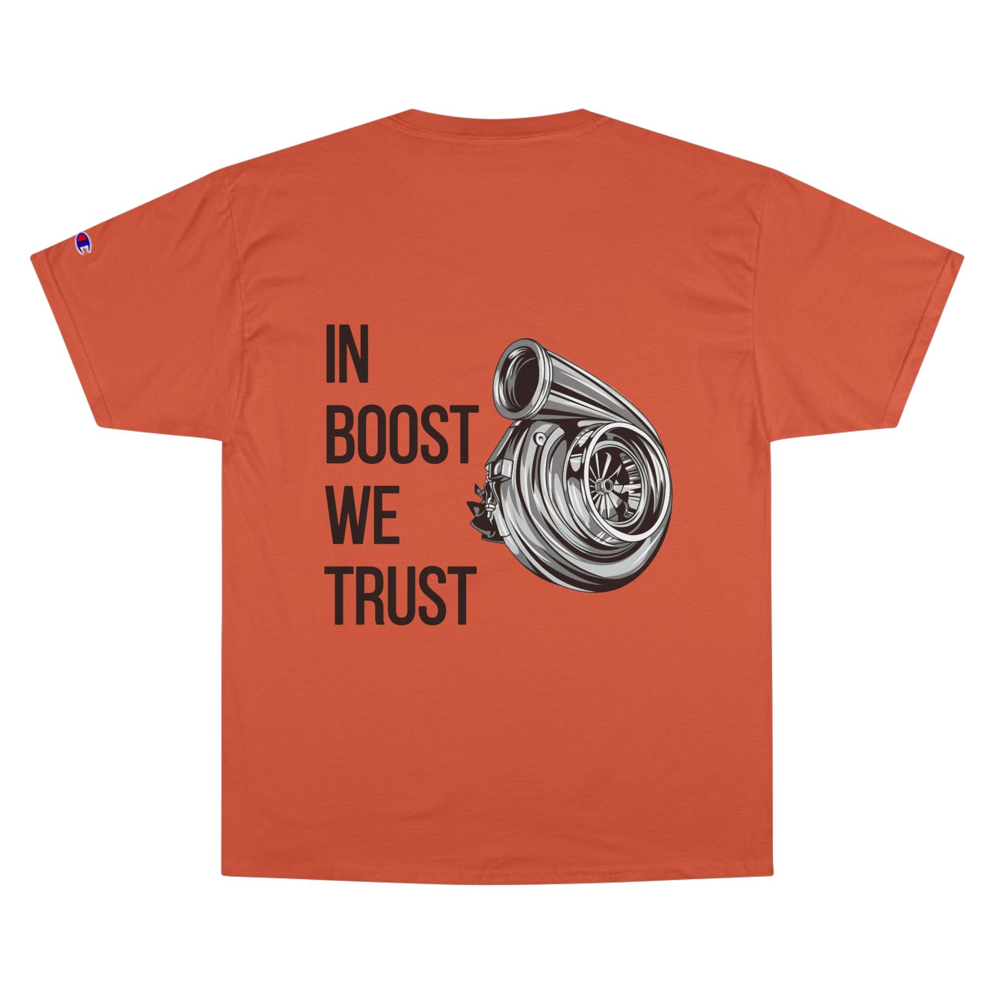 Champion Unisex T-Shirt “In Boost We Trust” Edition by Revolution Society for car enthusiasts. This classic fit T-shirt with 'In Boost We Trust' design gives a cool and laid-back vibe, perfect for car enthusiasts. It is great for casual wear or as a statement piece for car meets and shows. Ideal for birthdays, car related holidays, and automotive events.